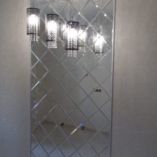 Использована серебристая квадратная зеркальная плитка размером 18х18.