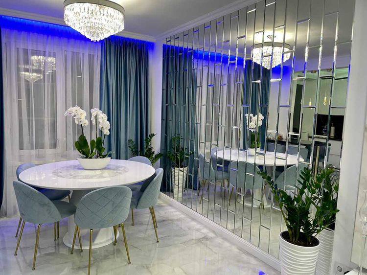 Панно из зеркальных прямоугольников. Лаконичное и строгое зеркальное панно- универсальный предмет интерьера для помещений в стиле "современная классика". Расстекловка в виде прямоугольных зеркал с фацетом не притягивает к себе внимание, в этом случае панно служит дополнением к остальным предметам, а не центром композиции. Подобное панно отлично расширяет и "осветляет" интерьер, не привлекая к себе внимания